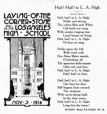Another impressive achievement is LA High’s very active student body. In 1879, the student body created the Star and Crescent literary society to promote the growth of its social organizations. As small debates developed, the Star and Crescent evolved into the Los Angeles Lyceum Debating Society in 1894. In addition to The Lyceum, several student run newspapers and magazines were created. The Blue and White Daily, the school’s newspaper, was once a daily 4 page newspaper maintained and paid for by student subscriptions. Later in 1912, the newspaper became a weekly paper and finally in 1962 after great debate, they dropped the “Daily” and became The Blue and White, a monthly published newspaper still running today. In conjunction with the core values of LA High, students also published El Romano, a newspaper in Spanish and Nuntius, a newspaper that published articles in English, Latin, and occasionally in Greek in the late 1920s and 1930s. (Samples of The Lyceum, El Romano, Nuntius and The Blue and White can be seen online in LA High’s library website at http://lashs.org/Archives/index.htm.)