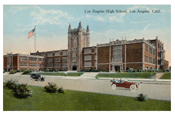 Until 1905, LA High was Los Angeles’ first and only high school. Construction of this monumental school started on July 19, 1872 on its first location in the downtown area, near First and Broadway. It opened its doors in 1873 and graduated its first class in 1875. The class consisted of only 7 members: Yda Addis, Henry O’Melveny, Jessie Peel, Lillie Miliken, Addie Gates, Henry Leck, and Mary Thomas. Later in 1890, LA high moved to its second location in downtown on Fort Moore Hill, off of North Hill St. and present-day Cesar Chavez Ave. However, it wasn’t until 1917 when LA High set its resilient roots in our neighborhood with 1,937 students.