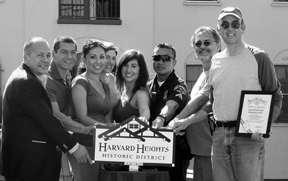 Enlisting the help of fellow residents Alex Marrache, Elizabeth Cooper, Marielle Farnan and Alec Tsongas, the North Harvard Heights Beautification Committee was formed. They named their project “Harvard Heights – Signs to Remind” and in January 2008 the Matching Grant Program awarded them a grant. With the securing of approval from such city entities as the Department of Transportation and the Department of Lighting, graphic designer Leanna Hanson was commissioned to create the designs and veteran city sign manufacturer Maneri Sign was hired to produce and install the chosen design. The project took almost 15 months to complete. Other invaluable contributors to the project included Harvard Heights’ residents Brian Beldham, Isabel Cruz, David Escobar, Erika Lopez, Mia Marano, Carmelle Neal, David Nico, Blanca Orellana, Evelyn Orellana, Benjamin and Karen Wade, and Steve Wallis. On the bright, sunny, early afternoon of October 25th in Harvard Heights, the North Harvard Heights Beautification Committee hosted a Block Party to publicize the coming of this historic signage for the neighborhood.