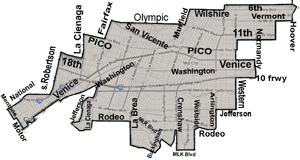 Neighborhood Councils and associations are also identified as “communities of interest” with an encouragement to keep them intact. John Gresham and Owen Smith from the Greater Wilshire Neighborhood Council (GWNC), expressed concern, at the Nate Holden meeting, about the area the GWNC currently represents, which is divided among districts 4, 5 & 10. They also felt that some in Koreatown may be overreaching by asking for a western border that pushes into GWNC territory. They were pleased to discover the new draft accomodated their wish to be unified and they ended up in CD 5. Steve Wallis from Harvard Heights told the commission that in the last redistricting effort the Harvard Heights Neighborhood Association had been divided into 2 council districts. He asked that they be reunited, and in the draft they are fully in CD10.