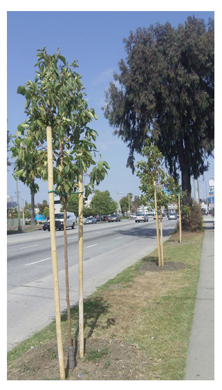 Peter Schulberg, President of the Olympic Park Neighborhood Council (OPNC), approached the Koreatown Youth & Community Center (KYCC) about a tree planting project along Olympic Blvd. OPNC then agreed to fund the project for a planting this spring. In April of this year, the Koreatown Youth & Community Center planted 24” box size Brisbane Box street trees along the south side of Olympic Blvd, between La Brea Ave and Crenshaw Blvd. The 17 Brisbane Box street trees will be watered and maintained by KYCC on a bi-monthly basis for the next two years. Thanks to Irma Garcia from KYCC for this report.